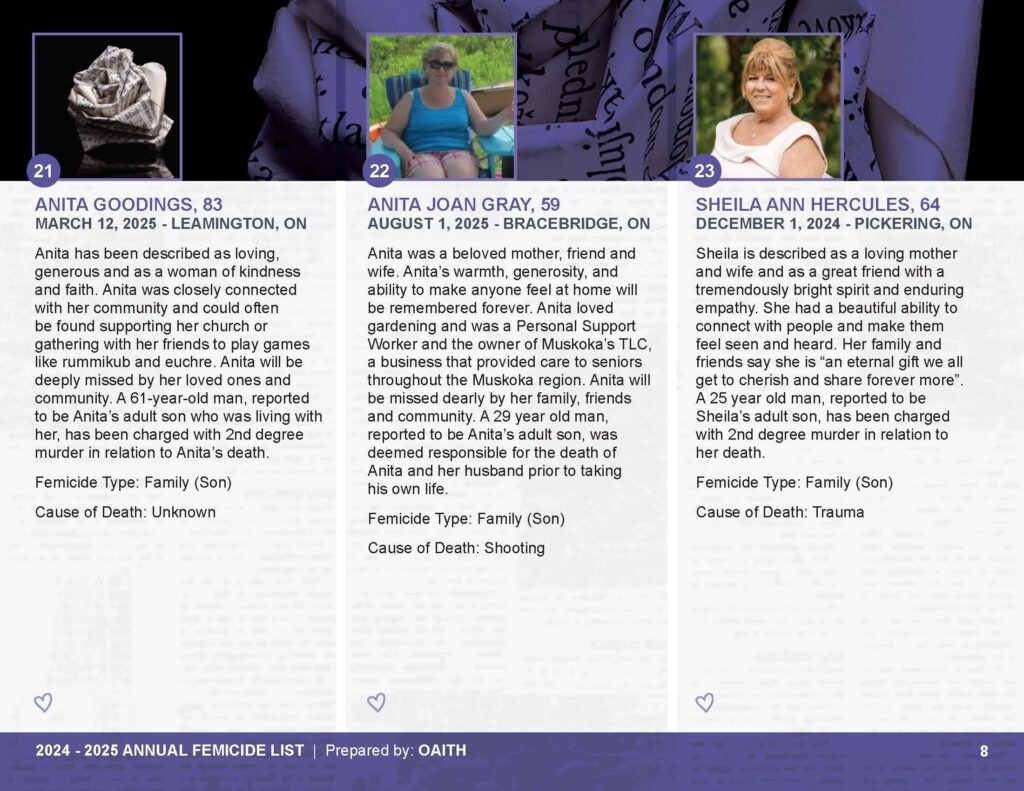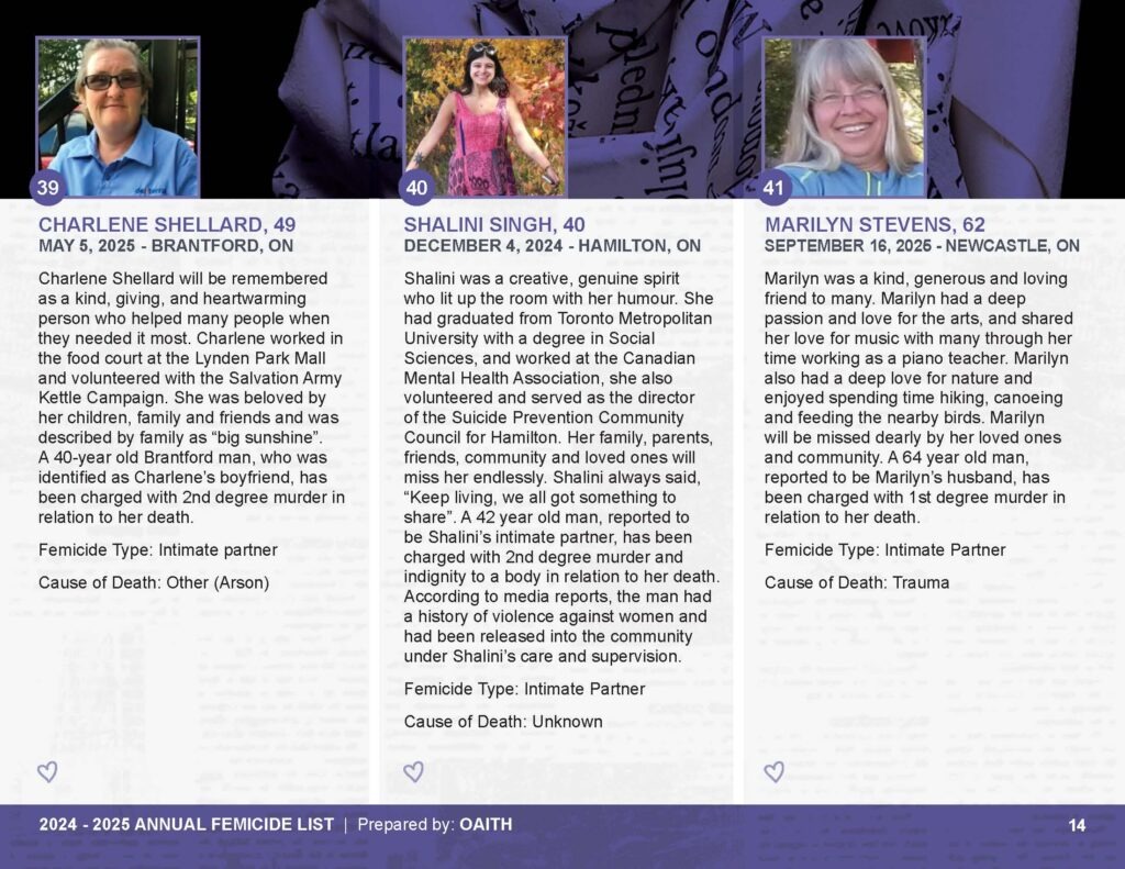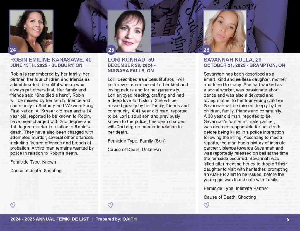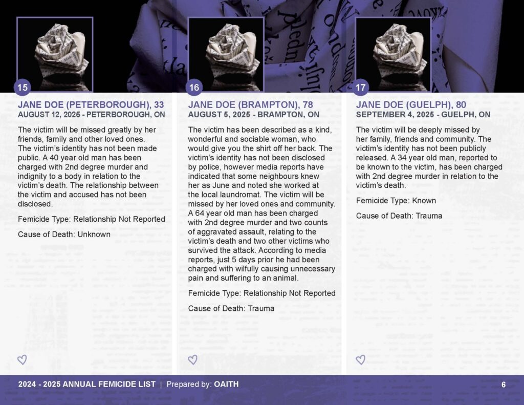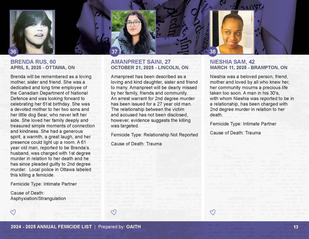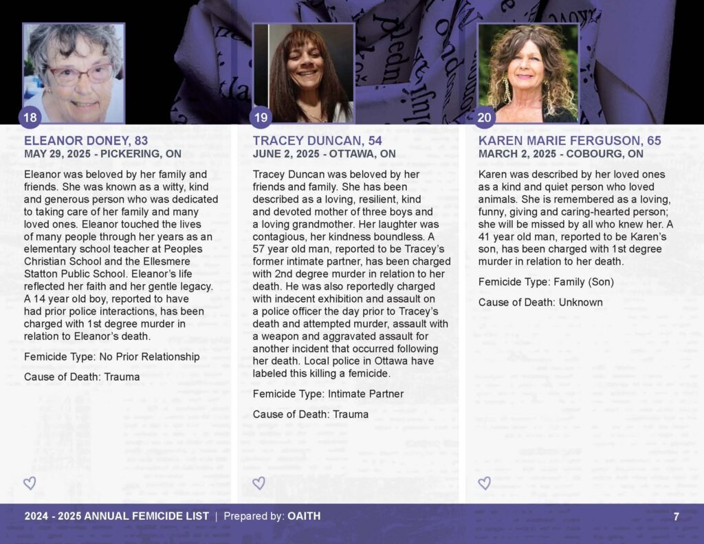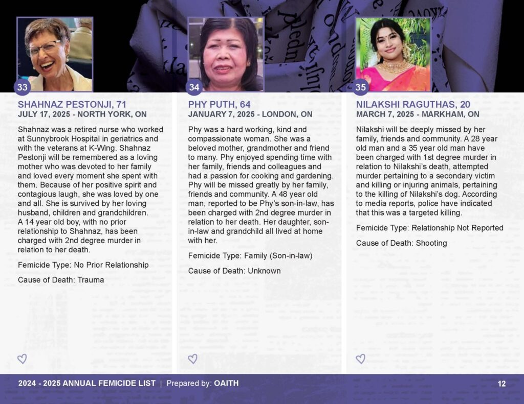 As we mourn these deaths, we also remember those whose lives are threatened by gender-based violence and honour the lives of those who have been killed.