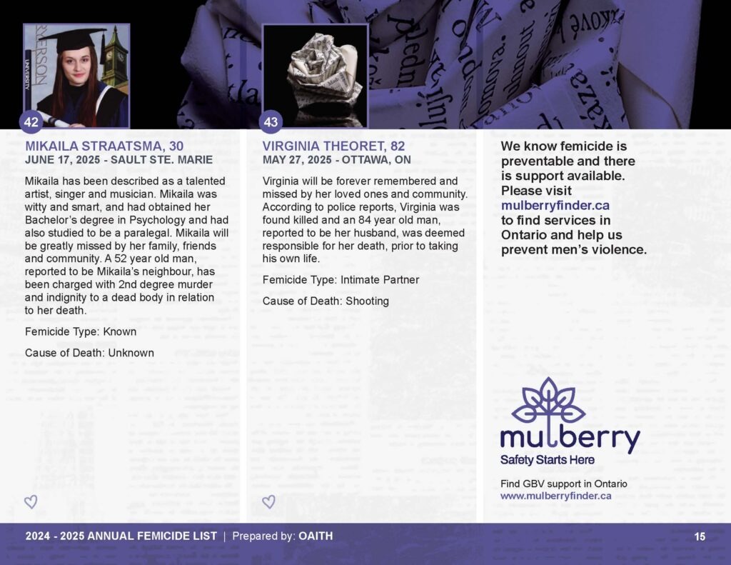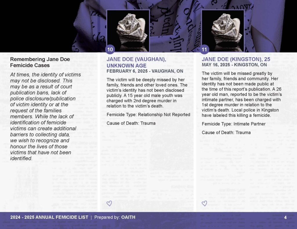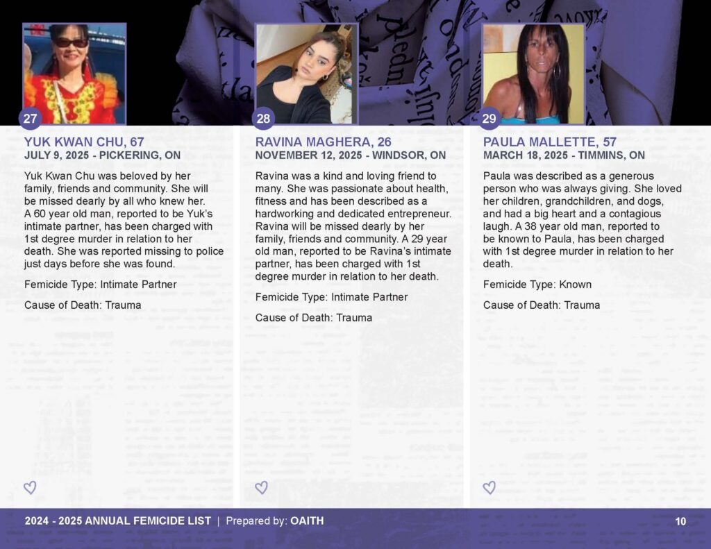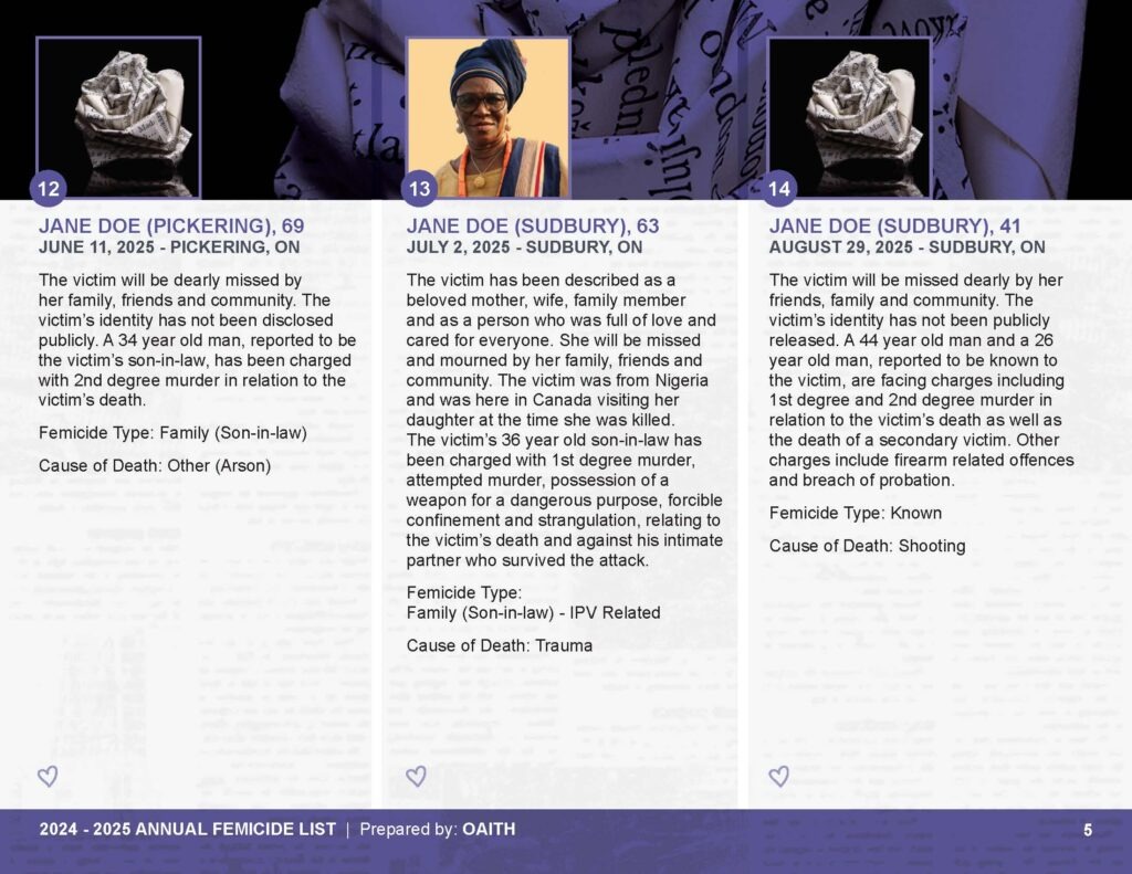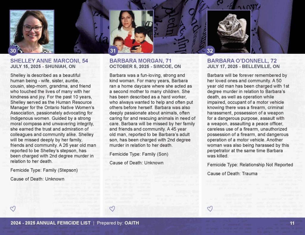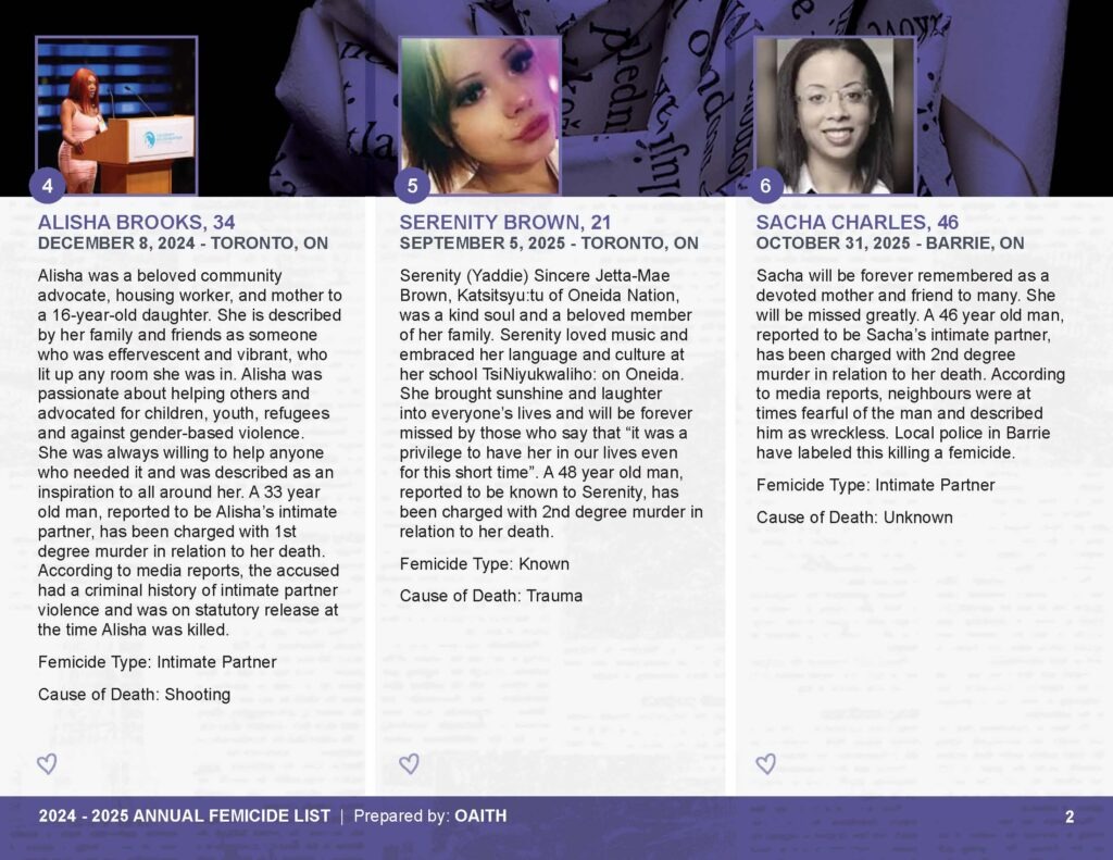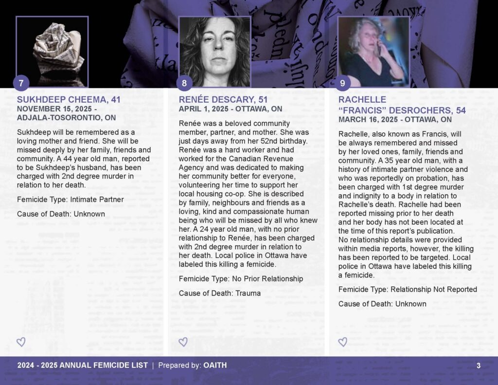 As we mourn these deaths, we also remember those whose lives are threatened by gender-based violence and honour the lives of those who have been killed.